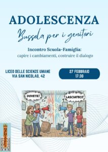 Si comunica che il giorno 27 Febbraio alle ore 17:30, presso la sede del Liceo delle Scienze Umane (Via San Nicolao 42), si terrà il convegno dedicato alle dinamiche del mondo giovanile e al rafforzamento del legame tra scuola e famiglia.